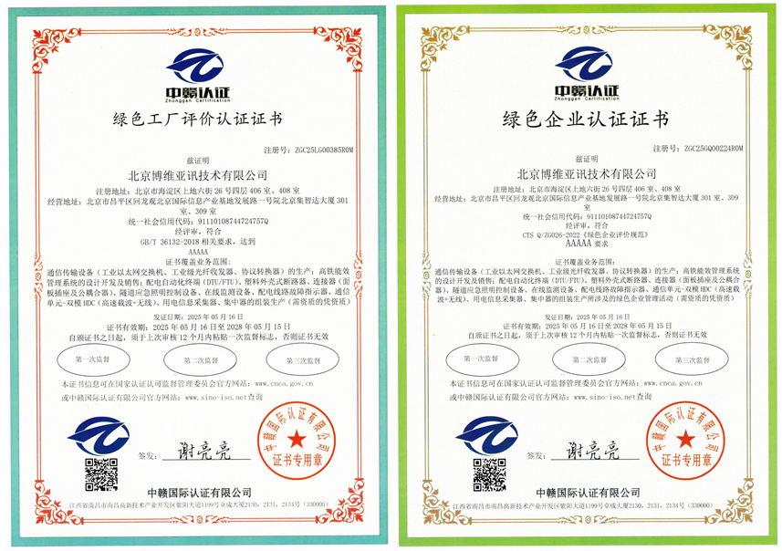 2025 年 5 月,北京博维亚讯技术有限公司顺利通过2025 版《绿色工厂评价通则》审核,取得“绿色工厂评价认证证书”和“绿色企业认证证书”,成为行业内首批同时摘得“双绿”招牌的企业之一。此次获证不仅标志着公司绿色制造水平跻身行业前列,也可享受财政、税收、金融、市场等多元优厚政策。